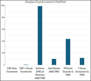 How much scientific support is enough? There are a few Cognitive Behavioral Therapy (CBT) studies showing minimal TMDs treatment effect even when added to "usual TMD treatment" (that being appliance therapy), and zero studies using CBT alone as the sole TMDs treatment. See Figure 2. Every other TMDs treatment approach overwhelmingly beats CBT in terms of evidence-based scientific support. The minimal published evidence promoting MPDS as a psychophysiological disorder that is marked by depression and somatization was apparently conjured, rather than being scientifically produced since it has never been replicated.34,35 It is well-known that Psychiatry as a profession, only accepts a somatization diagnosis (currently termed Somatic Symptom Disorder), after all possible physical causes have been diagnostically eliminated. The reason physicians have coined the term biopsychosocial rather than psychosociobiological is because they understand that biology must come first.26