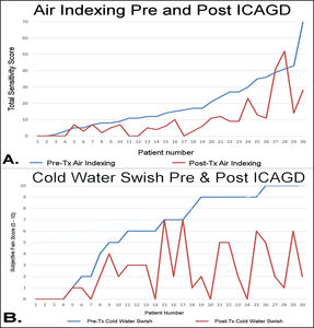 Line graphing for pre- and post- ICAGD sensitivity levels of CDH are shown in Figure 7A for air indexing and Figure 7B discloses values for cold water swish as found on the same patient treatment day. Figures 8A and 8B illustrate air indexing and cold-water swish line graph correlation coefficients pre- and post- ICAGD treatment for these CDH stimuli with reporting that both are related & improved by measured occlusal therapy.
